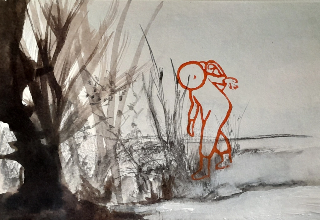 Después empecé a dibujar, aún en el taller de Juan, una extensa serie de interiores de hogares en pequeño formato con mucho color, todo muy recargado y decorado, con estampados en los sillones, en los papeles de las paredes y en las alfombras. Fue un período bastante largo, que de algún modo dio origen a Más humano imposible, un conjunto de obras del año 2020, relacionado con cuestiones que surgieron a partir de la pandemia. Empecé a hacer unos collages donde siluetas coloridas de seres humanos se recortaban sobre escenarios absolutamente post apocalípticos, creados con grafito y tintas oscuras, que simbolizaban el humo y la oscuridad de los cielos y las aguas, el precipicio y la piedra.
